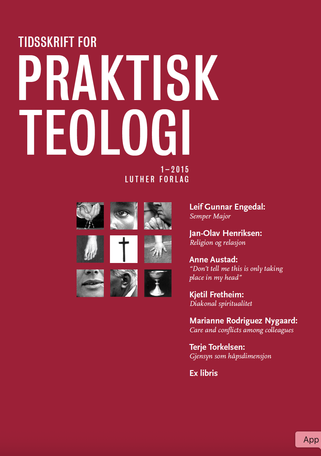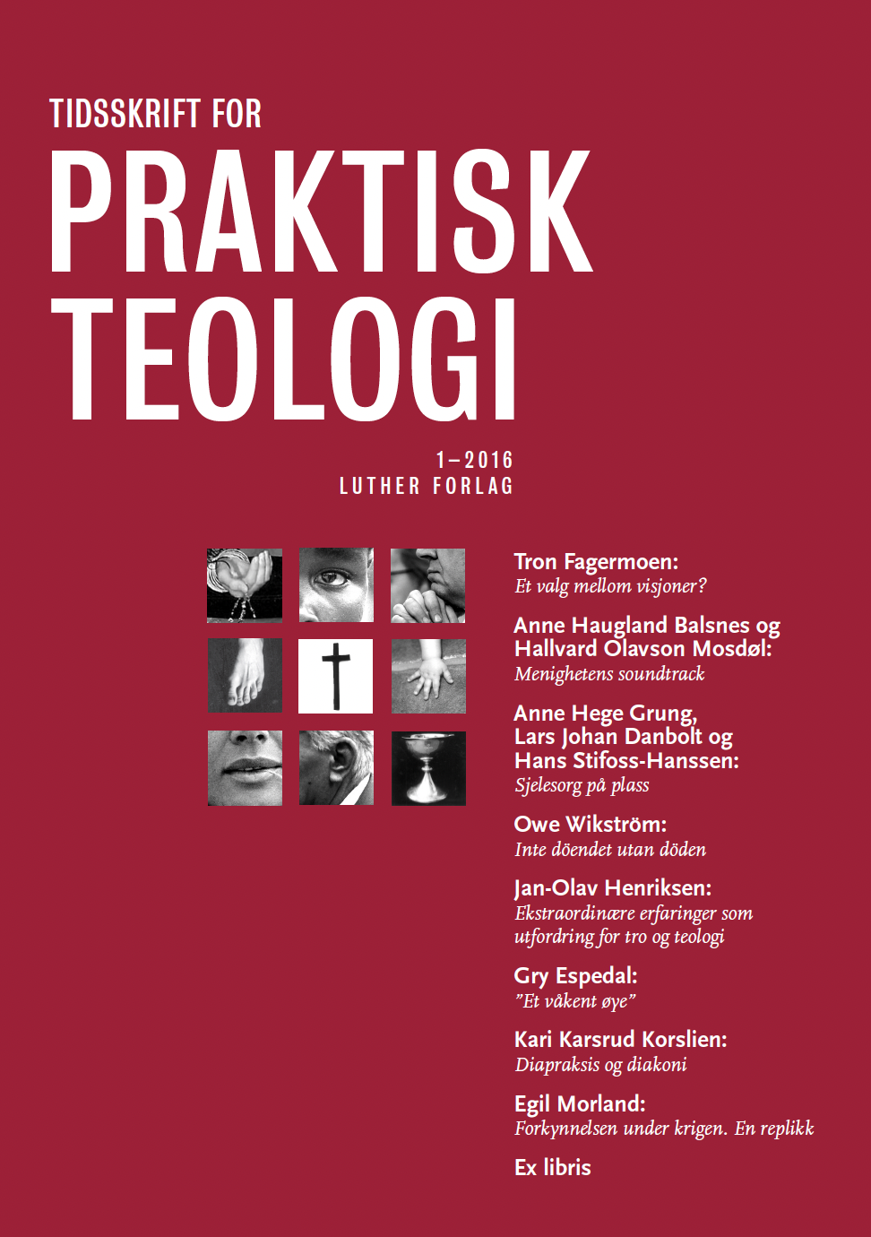 Fagfellevurderte artikler. Fagermoen: Et valg mellom visjoner? / Balsnes & Mosdøl: Menighetens soundtrack / Grung, Danbolt & Stifoss-Hanssen: På sporet av dagens sjelesorgpraksis i Den norske kirke / Wikström: Inte döendet utan döden / Henriksen: Ekstraordinære erfaringer som utfordring for tro og teologi / Espedal: "Et våkent øye".