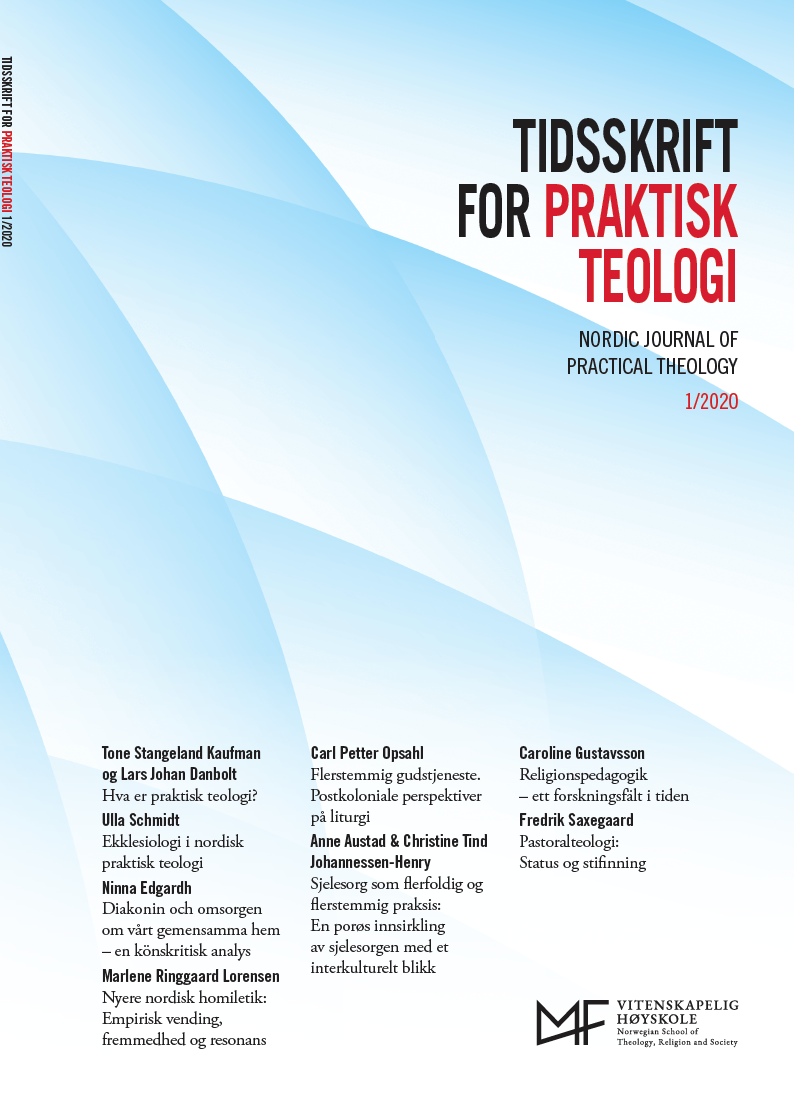 Fagfellevurderte artikler. Kaufman & Danbolt: Hva er praktisk teologi? / Schmidt: Nordisk praktisk-teologisk ekklesiologi: Aktuelt fagfelt og aktuelle spørsmål / Edgard: Diakonin och omsorgen om vårt gemensamma hem - en könskritisk analys / Lorensen: Nyere nordisk homiletikk - Empirisk vending, fremmedhet og resonans / Opsahl: Flerstemmig gudstjeneste - Postkoloniale perspektiver på liturgi / Austad & Johannessen-Henry: Sjelesorg som flerfoldig og flerstemmig praksis / Gustavsson: Religionspedagogik - ett forskningsfelt i tiden / Saxegaard: Pastoralteologi - Status og stifinning.