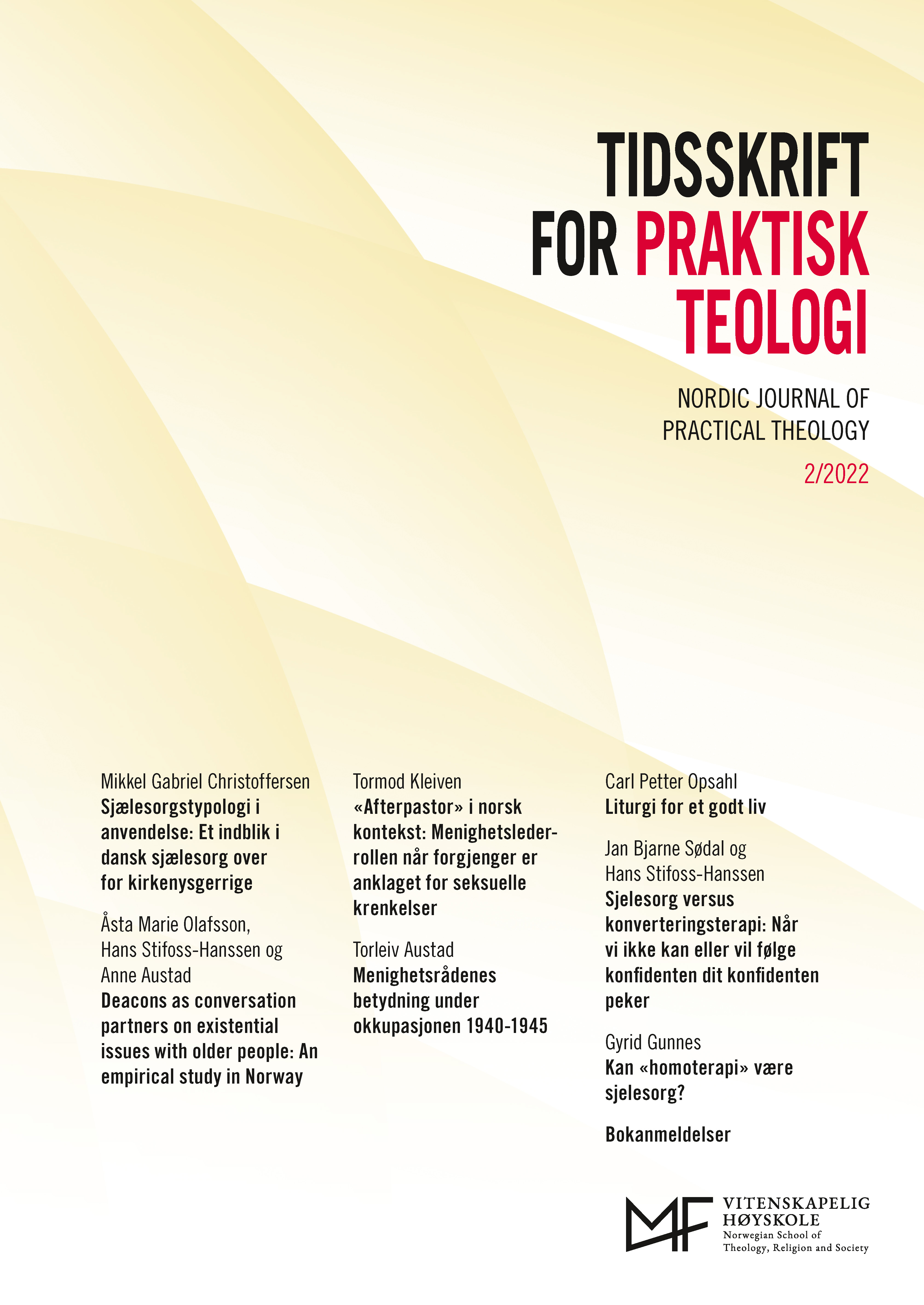 Fagfellevurderte artikler. Christoffersen: Sjælesorgstypologi i anvendelse / Olafsson, Stifoss-Hanssen & Austad: Deacons as conversation partners on existential issues with older people / Kleiven: "Afterpastor" i norsk kontekst / Austad: Menighetsrådenes betydning under okkupasjonen 1940–1945